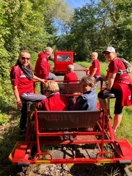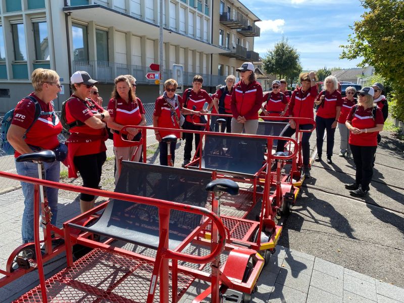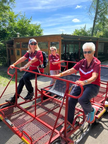 Dort erwarteten uns- natürlich auch in Rot – mehrere Schienenvelos. Nach einer kurzen Instruktion fuhren wir mit ihnen 4,5 km nach Witteberg. Dabei machte sich das wöchentliche Training positiv bemerkbar. Das anschliessende Mittagessen und später das Dessert fand bei allen grossen Anklang. Nach einer kurzen Wartezeit- einige verbrachten sie auf der Schaukel des Spielplatzes, die anderen nutzten sie zu einem Spaziergang- ging es mit den Velos zurück nach Laupen. Warum erschien uns die Rückfahrt länger? Lag dies am herrlichen Sonnenschein, am feinen Essen oder am Wein?