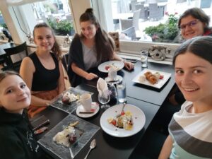 Immer mit einem Auge auf der Uhr, denn wir erwarteten noch Jana beim Hotel, konnten alle die Aussicht mit einer Glace-Pause auf dem Liegestuhl geniessen. Schon bald führte uns die Fahrt weiter und wir wussten nach wie vor nicht wohin die Reise geht.